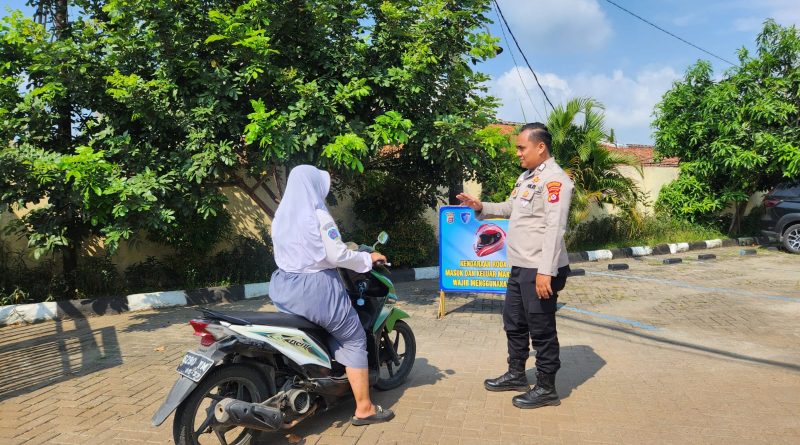 Seperti halnya Bripka Eki anggota lalu lintas Polsek Kramatwatu Polresta Serkot Polda Banten melaksanakan peneguran kepada masyarakat yang menggunakan sepeda motor tidak memakai helm di Lingkungan Mapolsek Kramatwatu Kec.Kramatwatu, Senin (20/4/2026).