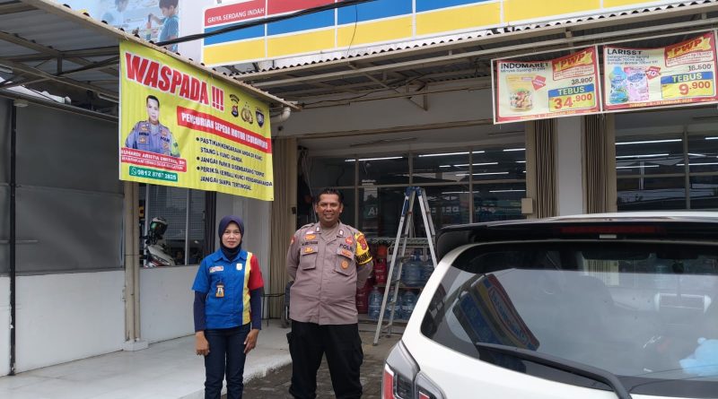 Anggota bhabinkamtibmas polsek kramatwatu Polresta Serkot memasang spanduk antisipasi curanmor di indomart desa margatani